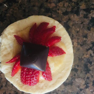 Place a small mound of the almond cream in the center of each bottom portion and then your toppings: either cut up fruit, or a small dollop of jam, or bit of chocolate.