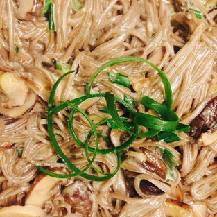8 ounces soba noodles (buckwheat noodles make a difference taste and texture wise) 6 ounces mushrooms (I use a mix of cremini and shiitake or a combination of your favorite) 2 tablespoons olive oil 1 tablespoon champagne or white wine vinegar 1 giant heaping tablespoon red miso paste 4-5 tablespoons butter, softened 5 garlic cloves either thinly sliced or minced 2/3 cup heavy cream 2-3 stalks of scallion, finely sliced, separate the whites from the greens as best you can pinch salt black pepper to taste